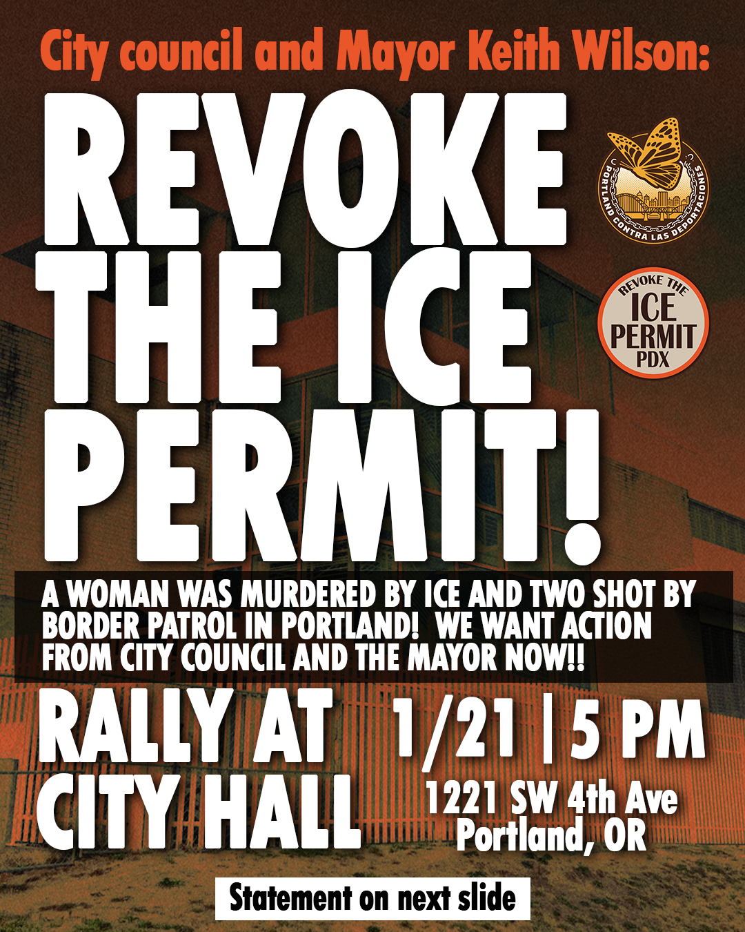 Portland City Council and the mayor have the ability to kick ICE out of Portland by revoking the permit for the Portland ICE Facility at 4310 S Macadam Ave. (https://nextcity.org/urbanist-news/portland-is-taking-steps-to-revoke-an-ice-facilitys-land-use-permit) Despite over 1,000 emails sent to city council and the mayor, hundreds of public comments and rallies to demand the facility is shut down, the city has taken no action to shut down the facility or to fine the owner of the facility for violations of its conditional use permit. So on 1/21 at 5 PM we will rally at Portland City Hall to demand city council and the mayor put forth immediate legislation to shut down the ICE Facility. It cannot wait another day! Join us in saying ICE out of Portland and revoke the ICE permit! We will go into the chambers at 6 PM for public comment. Meet at 1221 SW 4th Ave, Portland, OR at 5 PM.