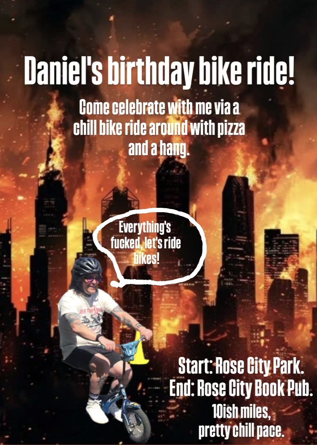 Hey y'all, Come celebrate of existence with me via this bike ride. We'll start at Rose City Park (NE), Mosey on over for a slice at Baby Doll Pizza. Then continue on for a little bit to end at Rose City Book Pub. Message @Dandevilman for questions, any other info.