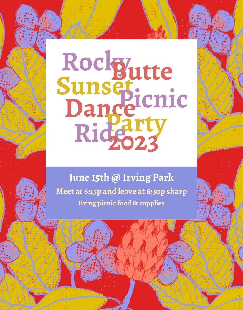 This is the traditional Rocky Butte Sunset Picnic Dance Party Ride. TNR will meet up with us after dark per tradition but we'll plan on getting there much earlier to watch the sunset and picnic. There will be a SHORT store stop but please come as prepared as possible for the picnic. Other Sunset Picnic Series dates: May 24: Mt Tabor https://www.shift2bikes.org/calendar/event-17026 July 20: Pop Punk Picnic https://www.shift2bikes.org/calendar/event-17353 Aug 23: TBD Email me for location and music theme ideas! Floral Illustration by Brooklyn Paige IG:@heycosmicbug