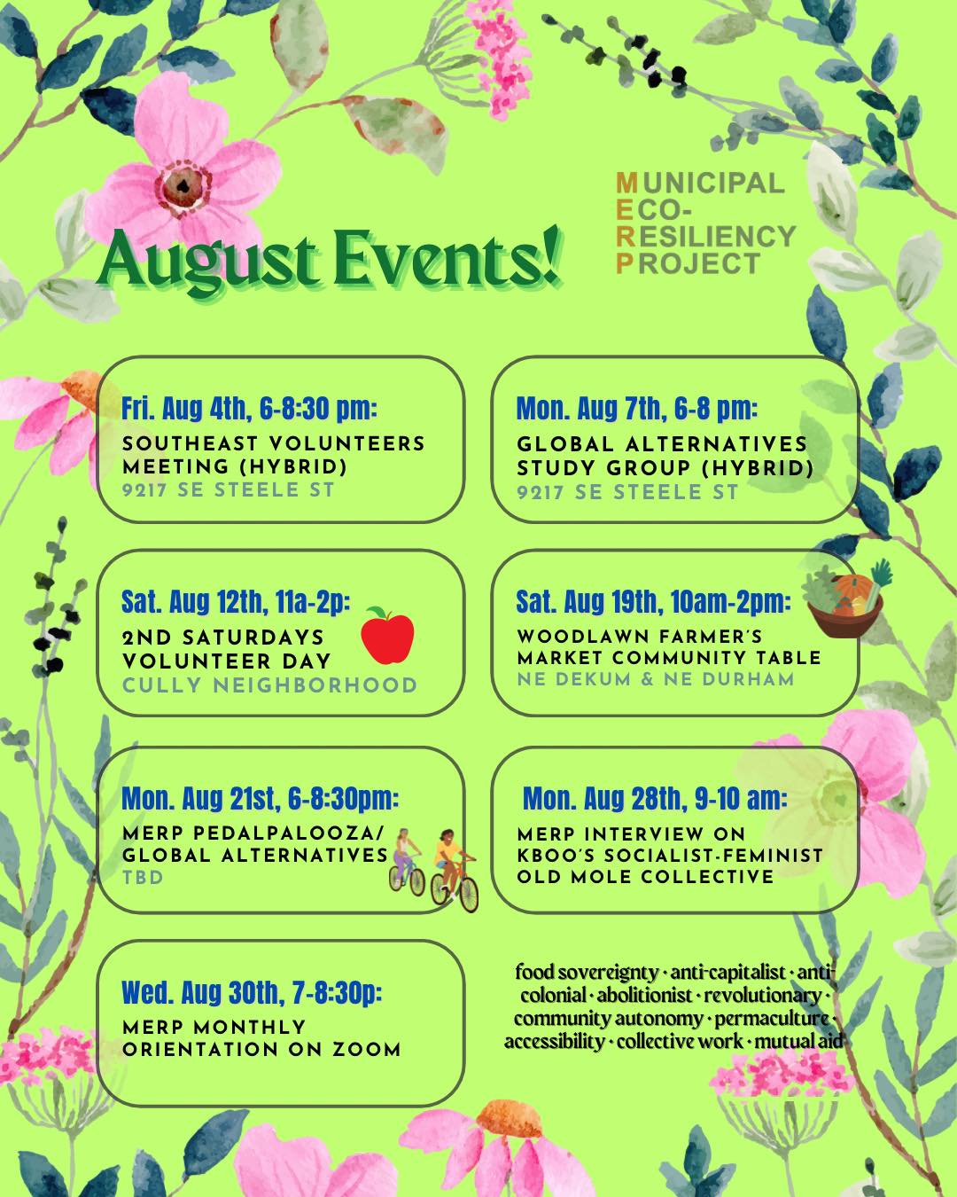 Its happening tonight, the air quality is good again! Tour of Southeast Mutual Aid, co-op and garden projects. Monday August 21st Meet at 5:30, Ride 6-7, Potluck and study group 7:00- 8-30 Come tour SE Portland's Community Gardens with the Municipal Eco Resiliency Project (MERP) - The bike tour will start at the Gardens at the Base of Mt Tabor and will end at MERP office and GreenHouse. Following the tour you're invited to eat with us and join a causal study group led by MERP Educational Facilitator Anthony. The tour will include community gardens, street murals, and an urban Eco-village. Slow paced tour Approx 3.5 miles one way. Tour ends near the Lents Max Station. BIkeTown is supporting this ride and providing Ride codes for you to test out our newish Electric assist Bikes 10 people can use the promo code MERP2023 for a $30 credit Contact Benjamin to learn how to use it or any accessibility needs. Bayer@lyft.com Your Invited to wear Green Orange or Black! The Municipal Eco Resiliency Project, aka MERP is about expanding grassroots organizing and attaining sustainable resources with marginalized communities as we build community power for food sovereignty to meet the scale of climate change before the year 2030. Possible route here https://www.google.com/maps/dir/Mt.+Tabor+Community+Garden,+6001-6399+SE+Lincoln+St,+Portland,+OR+97215/45.4973779,-122.5994721/45.4902855,-122.5977728/45.4938545,-122.5942521/45.4845598,-122.5680618/@45.4839557,-122.5985604,2929m/data=!3m1!1e3!4m27!4m26!1m5!1m1!1s0x5495a059cacb3d45:0x999bb60b597046db!2m2!1d-122.5982885!2d45.5081079!1m10!3m4!1m2!1d-122.6017624!2d45.4965396!3s0x5495a069cc89ff13:0x6636e0689d0e625d!3m4!1m2!1d-122.6017382!2d45.4938351!3s0x5495a06bd3366c7d:0xb9bee439d14a7abf!1m0!1m5!3m4!1m2!1d-122.5723019!2d45.4879486!3s0x5495a03abb581583:0xfa912a5436e36783!1m0!3e1?entry=ttu