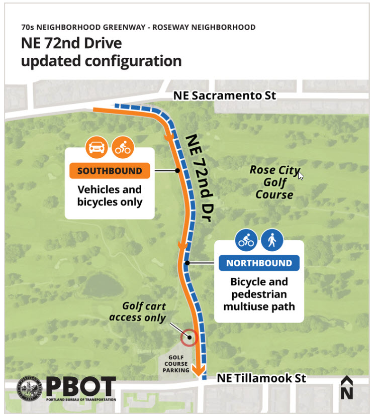 The 70s Greenway is close to complete, and just this past week PBOT installed new concrete barriers on NE 72nd Drive where it ascends through Rose City Golf Course. This makes that road through the park bicycle and pedestrian only in the uphill direction. This 6-mile group ride covers nearly the entire length of the 70s Greenway starting from Mount Scott Park. This is not too far from the southern end of the greenway. On the ride you will see a way to safely get across SE Powell Blvd, as that is a crossing that PBOT (in conjunction with Trimet) has not yet completed. The ride ends at Rose City Grill, which is right next to those new concrete barriers. This is a great restaurant with incredible fries, plenty of indoor/outdoor seating, restrooms, and a great view of the park. Hope to see you on the ride!
