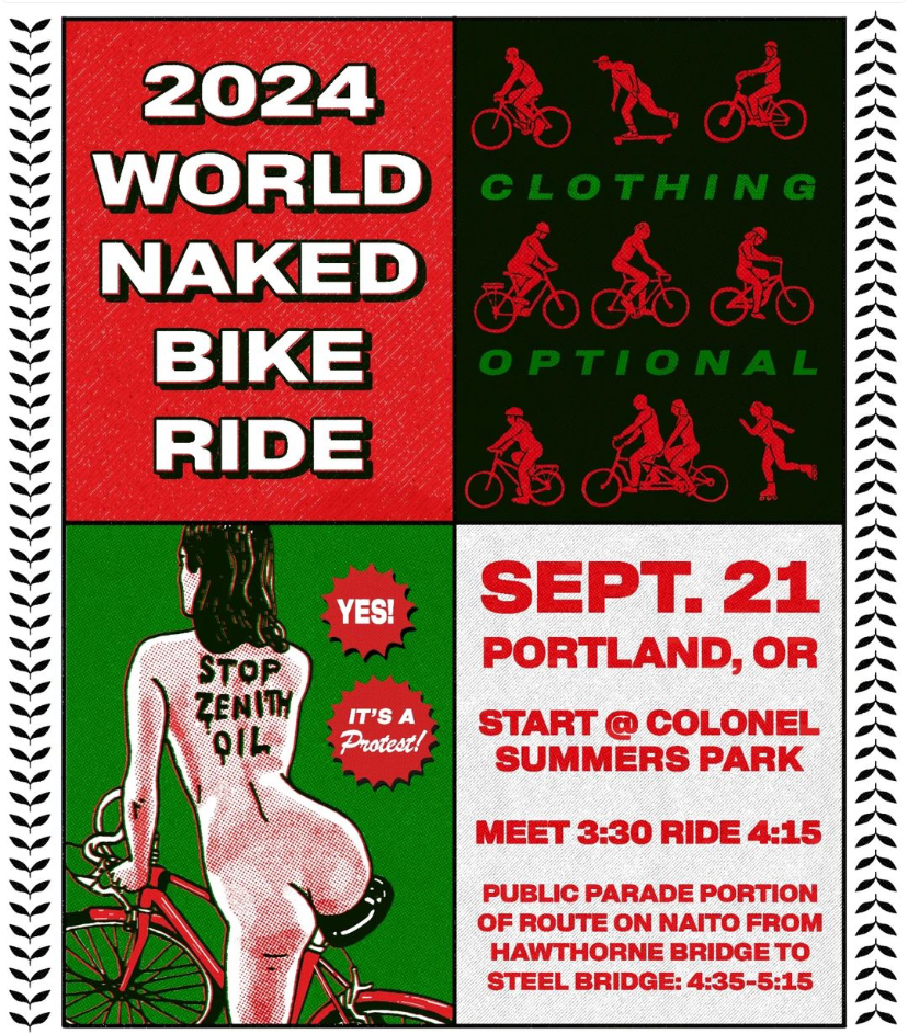 This Saturday! September 21st 3:30 PM Colonel Summers Park SE 20th & Belmont Celebrating and Honoring the 20th Anniversary of the World Naked Bike Ride in Portland! (*not associated or involved in any way with PDXWNBR, which took a year off) 20 years of us riders bringing attention to: 1. Our Vulnerability as cyclists 2. Our Dependence of fossil fuels 3. Body Positivity Bare as you dare . . . Hopefully we won’t have to still be protesting in another 20 years! 🚲❤️ Diablo “THIS YEAR’S RIDE Join us on SEPTEMBER 21st at Colonel Summers Park in SE Portland. Meet at 3:30pm, ride begins at 4:15pm. There will be live bands and DJs when the ride ends! Why: More to come, but this year, 2024, we protest against Zenith Energy and call for action by DEQ and the city and state to protect residents, The Columbia Gorge and hundreds of miles of fragile environments, as well as residents of the city of Portland and the communities along the routes these trains pass through. We also seek greater protection for the workers, Union members, Engineers and freight workers who would be the first impacted by an accident. Safety: We are first responsible for ourselves and then others around us. Please ensure, you’ve water/food, a bike in good working order and please be conscious of drinking or any drug use and the increased risk it can put you and others at. By taking part in the ride you acknowledge you are responsible for yourself and accountable for your actions towards others and their property.” This ride is unaffiliated with PDXWNBR, Pedalpalooza or Umbrella. Contact Information For media inquiries, please contact: Máximo Castro, Press Liaison Email: worldnakedbikerideportland@gmail.com Instagram: @worldnakedbikerideportland Website: worldnakedbikerideportland.com