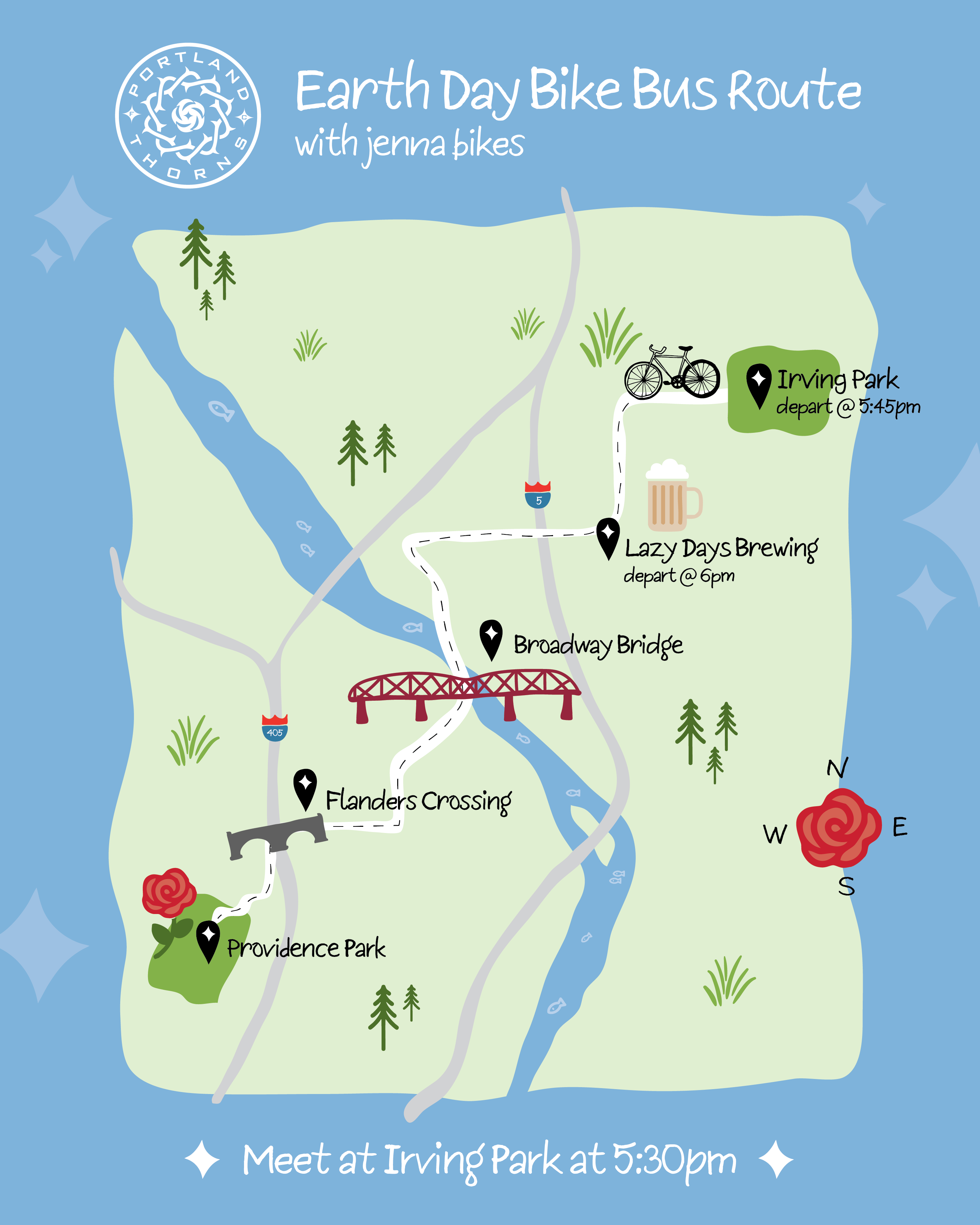 Join Jennabikes and the Thorns for a bike bus to celebrate Earth Day! Ride leaves from Irving park to pick up people at Lazy Days at 5:45. Departing from Lazy Days at 6pm. We will bike over the Broadway bridge and the Flanders crossing together to arrive at the game around 6:30!